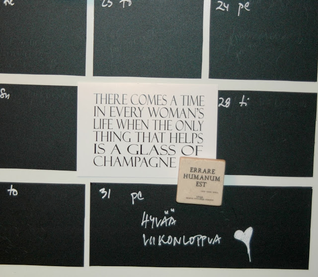 Kirjakaupasta löytyi myös pari tekstikorttia, joista pidän myös paljon. Toinen on Äiti Teresan lausuma, ja toinen Bette Midlerin. Asetin ne eteiseen isoon sähkökaappikalenteriimme magneeteilla. (Sähkökaapin piilottamisesta oma postaus 12/2013) Kortit mahtuvat hyvin tammikuun kalenteriin, koska se on onneksi melko tyhjä toistaiseksi kiireisen joulukuun jälkeen :)